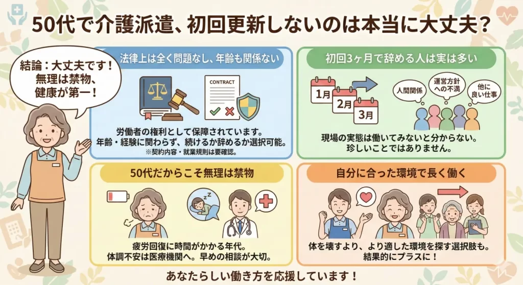 「50代で介護派遣を始めたけど、思っていたより体力的にきつい…」「初回の更新、断ってもいいのかな」そんな不安を抱えていませんか?